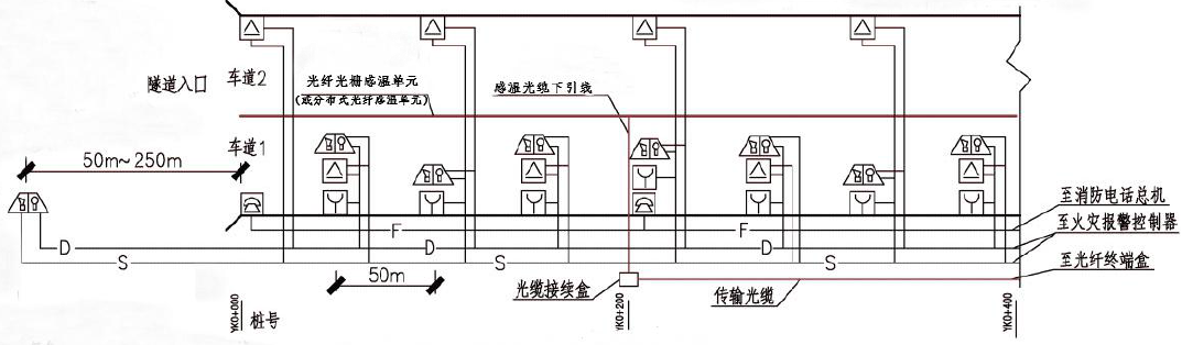 分布式光纖線型感溫火災(zāi)探測(cè)器(或光纖光柵線型感溫火災(zāi)探測(cè)器)應(yīng)設(shè)置在車道頂部距頂棚100mm~200mm,光纖光柵線型感溫火災(zāi)探測(cè)器的光柵間距不應(yīng)大于10m;每根分布式光纖線型感溫火災(zāi)探測(cè)器和光纖光柵線型感溫火災(zāi)探測(cè)器保護(hù)車道的數(shù)量不應(yīng)超過(guò)2 條;探測(cè)范圍要求整個(gè)隧道全部覆蓋無(wú)探測(cè)盲區(qū)。