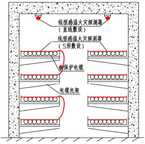 隧道內(nèi)應(yīng)沿電纜設(shè)置線型感溫火災(zāi)探測(cè)器,且在電纜接頭端子等發(fā)熱部位應(yīng)保證有效度;隧道內(nèi)設(shè)置的線型感溫火災(zāi)探測(cè)器可接入電氣火災(zāi)監(jiān)控系統(tǒng)。無(wú)外部火源進(jìn)入的電纜隧道應(yīng)在電纜層上表面設(shè)置線型感溫火災(zāi)探測(cè)器;有源入可能的電纜隧道在電纜層上表面和隧道頂部,均應(yīng)設(shè)置線型感溫火災(zāi)探測(cè)器。線型感溫火災(zāi)探測(cè)器采用“S”形布置或有外部火源進(jìn)入可能的電纜隧道內(nèi),能響應(yīng)火焰規(guī)模不大于100mm 的線型感溫火災(zāi)探測(cè)器。如圖3所示: