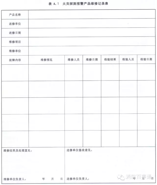 火災探測報警產品維修記錄表的格式見表A.1